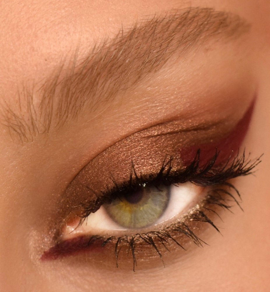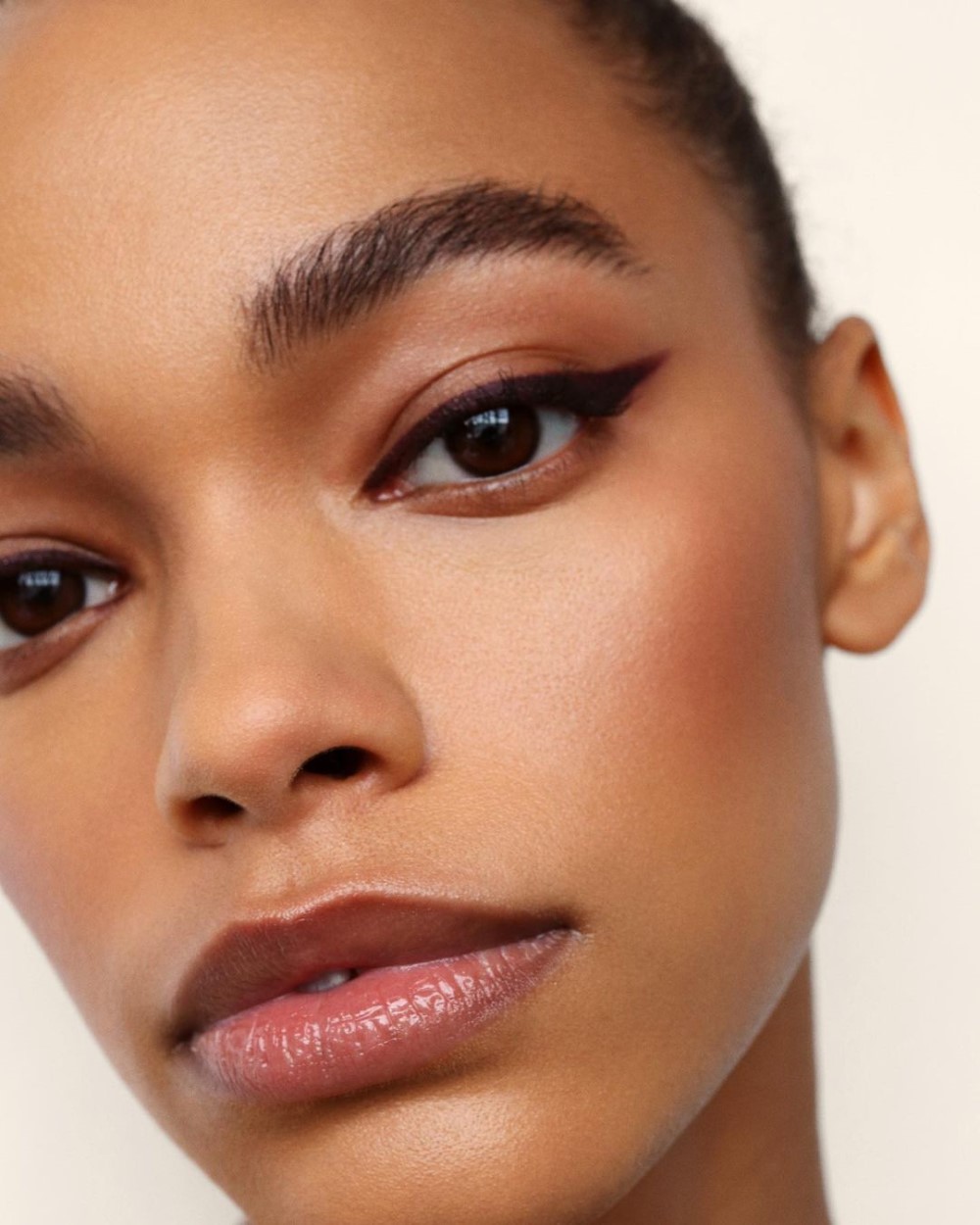 In 2021 the focus is kept on the eyes with winged eyeliner. For Spring, this timeless eye makeup look has been seen mostly in anything but black. Marc Jacobs Beauty perfectly demonstrates how to use deep purples, reds, and browns to add playful sophistication to a daytime look. For evening, apply coloured eyeliner over moody shimmery eyeshadow.
