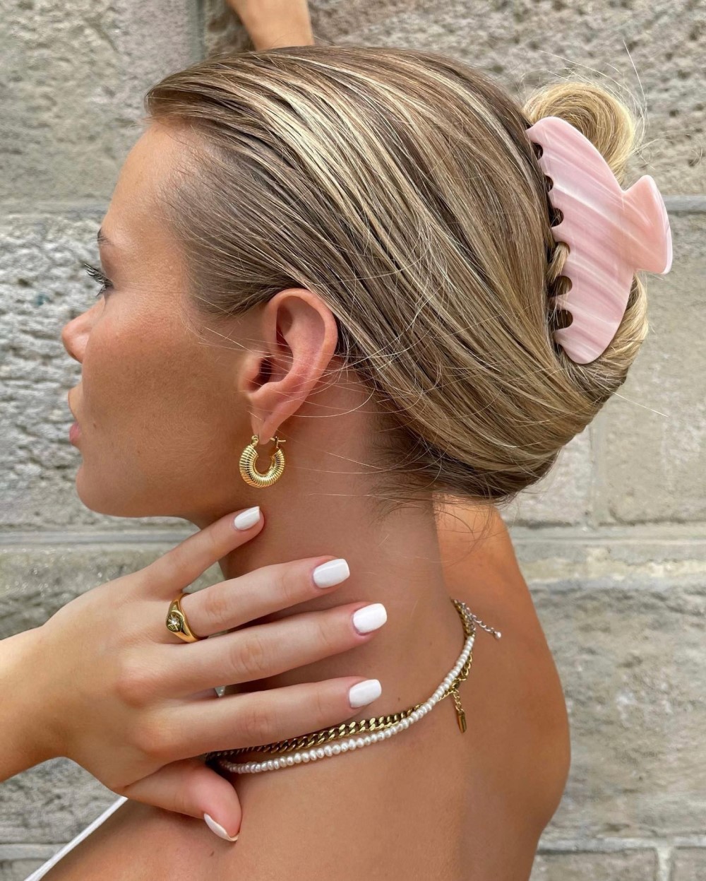 Nothing conveys effortlessness like a simple claw clip that blends with your hair colour. This paired-back combination works well for any occasion. Opt for simple designs in solid colours for a polished finish.