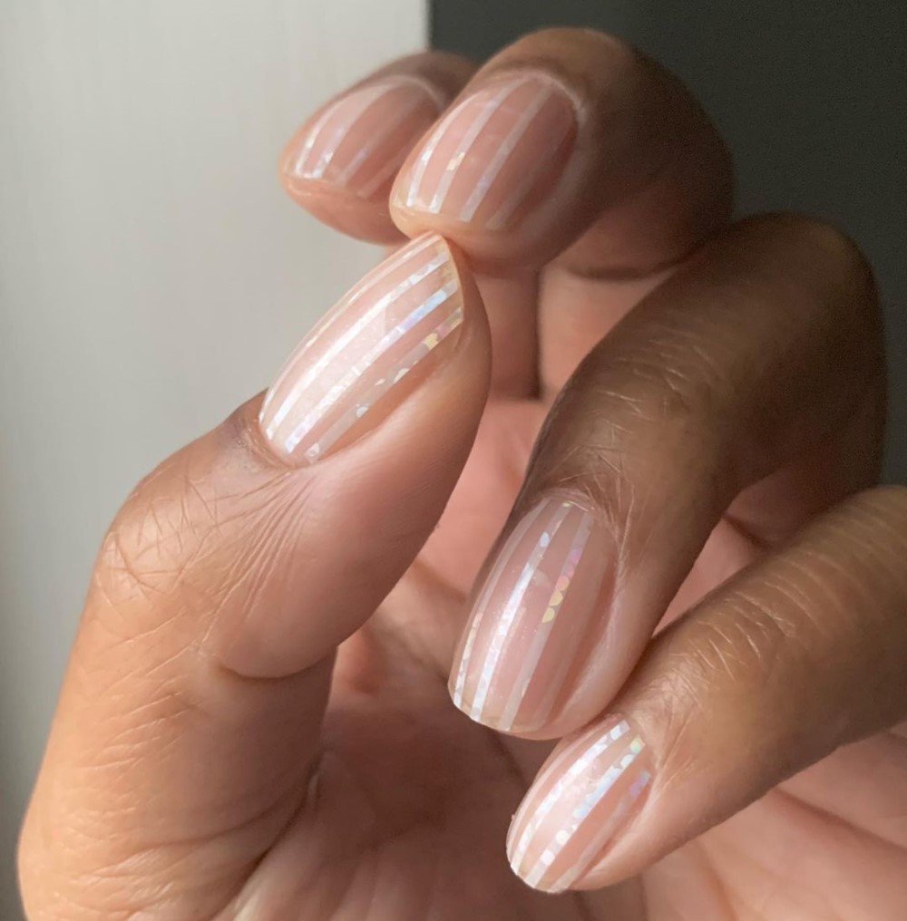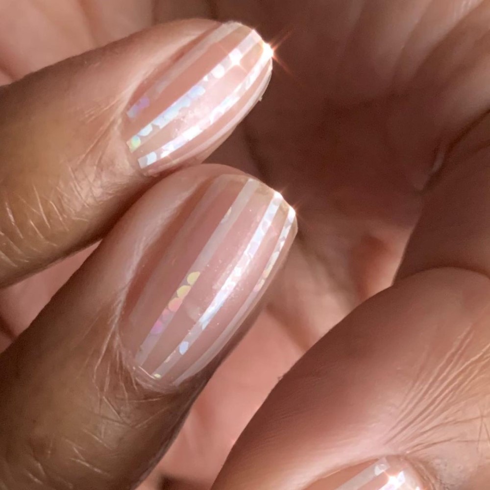 A veil of sheer pearlescent colour will add some edge to a classic French manicure.