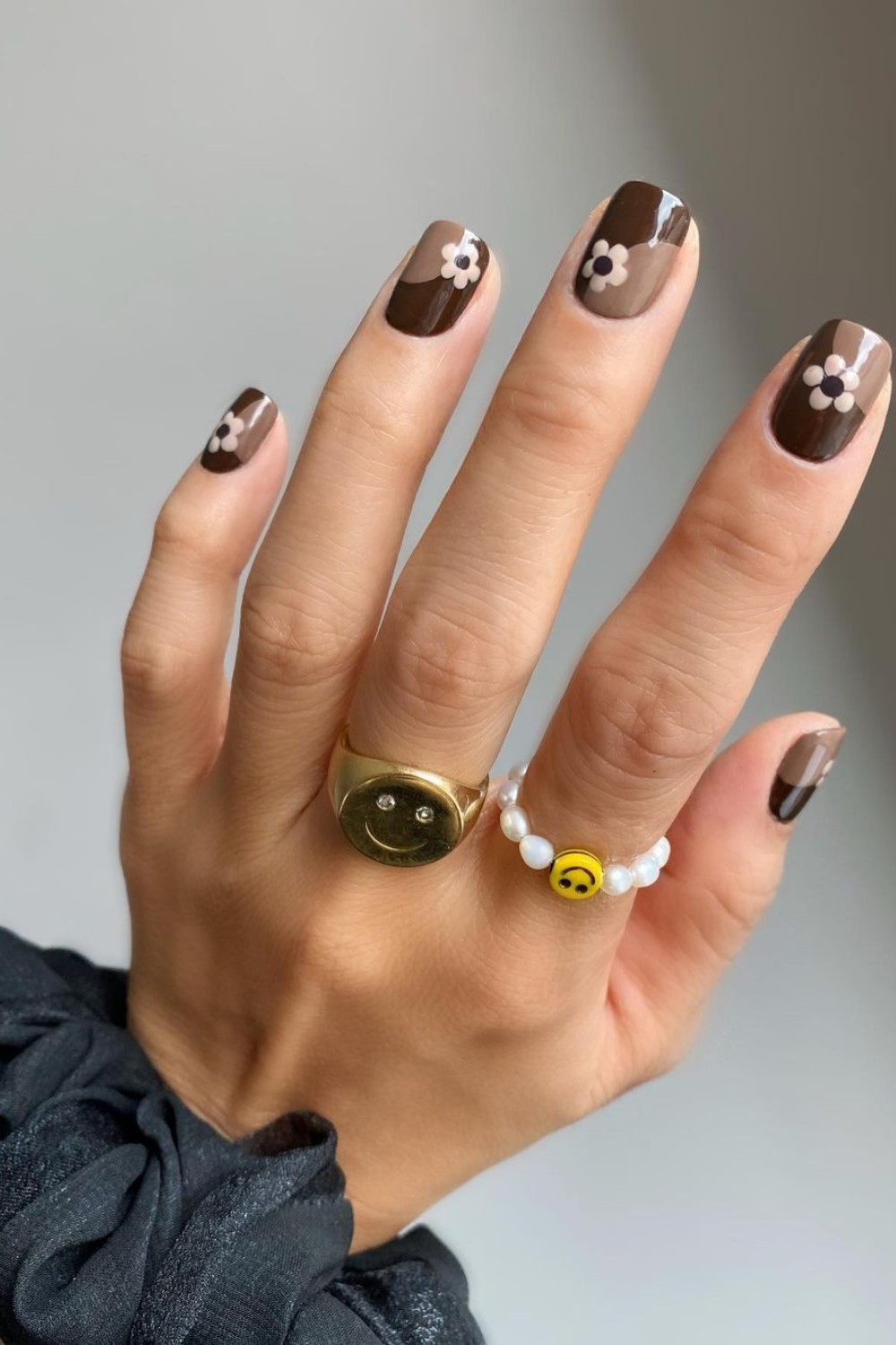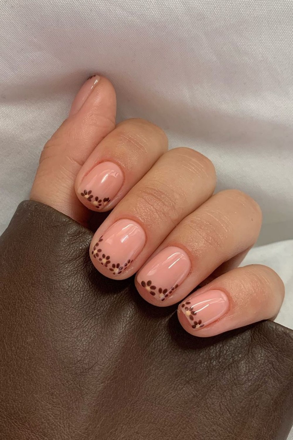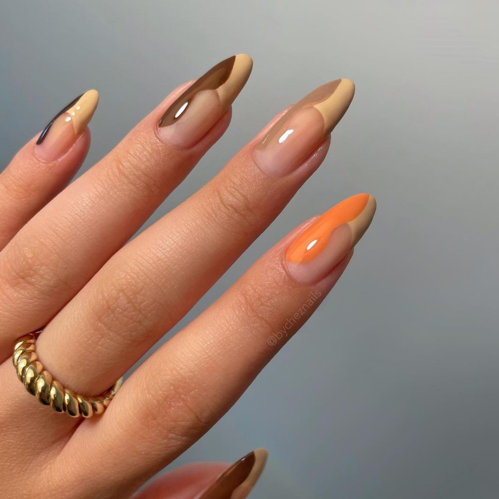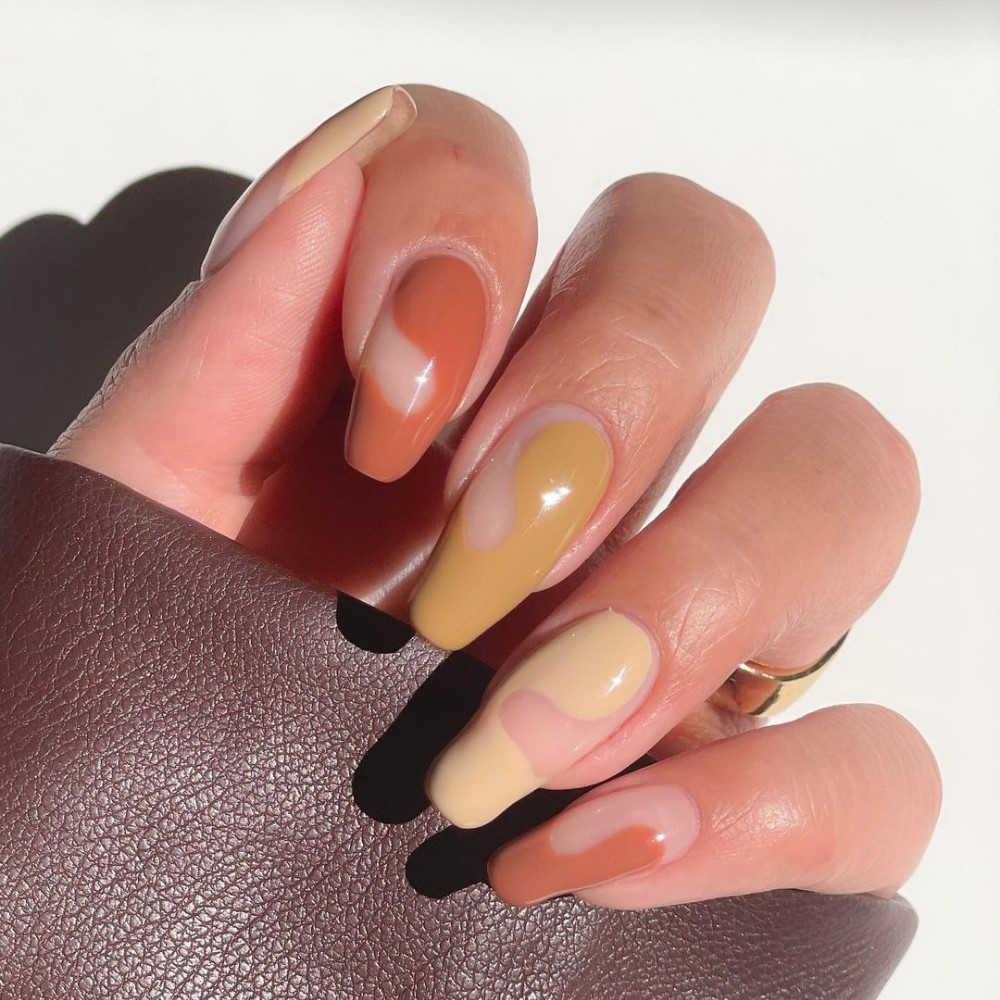 Make your next negative space manicure autumn-appropriate with coffee and caramel swirls. Finish off with a super-shiny top coat.